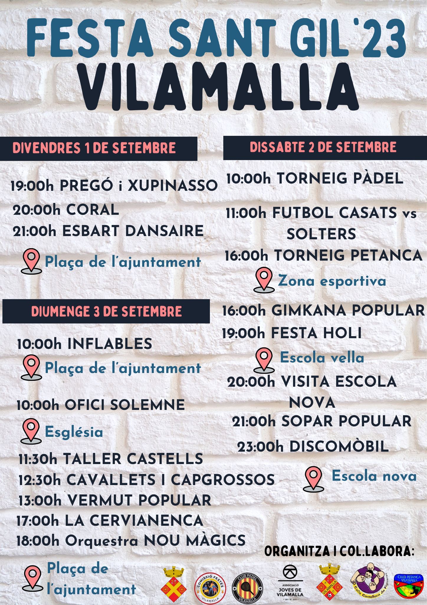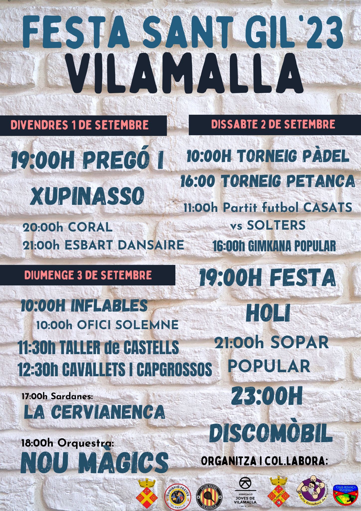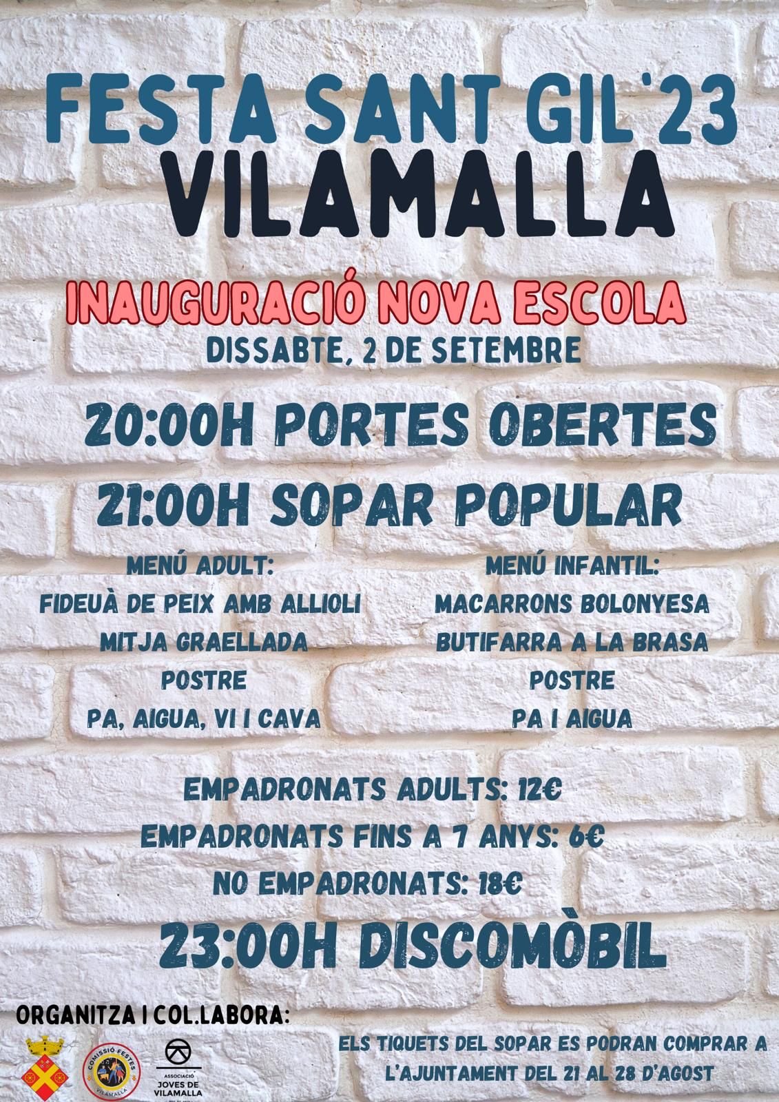Agenda, Anunci, Notícies Festa Sant Gil 2023 A continuació us presentem el programa de la Festa Major de Vilamalla pels dies 1, 2 i 3 de setembre. Per adquirir els tiquets del sopar, adreçeu-vos a l’Ajuntament, des d, 21 d’agost, fins al dia 28 d’agost. < Entrada AnteriorEntrada Posterior >