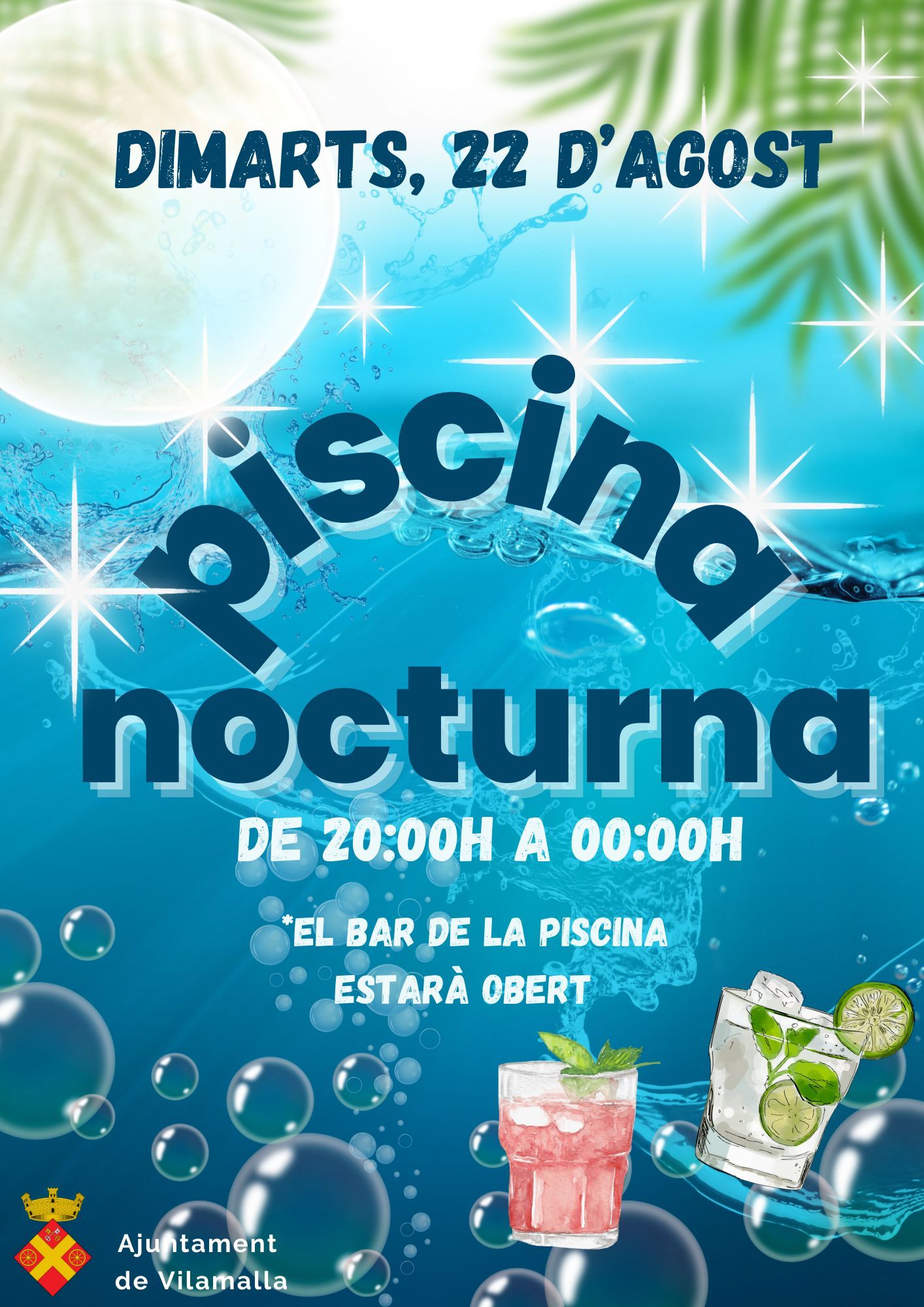 Agenda, Anunci, Notícies Obertura piscina nocturna Aquest dimarts, 22 d’agost, la piscina municipal obrirà fins a les 00 h, amb servei de bar!! Us esperem a tots i totes! < Entrada AnteriorEntrada Posterior >